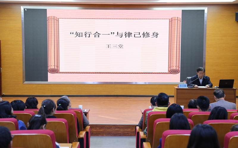 王三堂以修身“三问”即何为修身、为何修身、如何修身三个方面进行讲解。他从“知行合一”的角度重点阐述了如何修身,指出修身就要真修、修身贵在律己、修身须要有恒。他认为,要修身,要“知行合一”,首先要在“知”上、在“理”上、在“心”上下功夫,并强调了修身要持之以恒,要把指导思想搞端正。