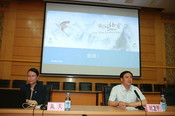 新闻中心讯(记者 孙雨蝶)5月17日下午,文化与传播学院邀请北京2022年冬奥会冬残奥会组织委员会文化活动部副部长高天,作“纯洁的冰雪,激情的约会”北京2022年冬奥会文化专题报告。校党委常委、副校长刘建平出席并主持报告会,文化与传播学院党委书记翟建北、院长张金桐、副院长马瑞与200余名师生到场聆听。