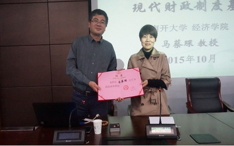 讲座开始前,王晓洁为马蔡琛颁发了客座教授聘书。(撰稿:财政税务学院 翟亚宁 摄影:刘悦)