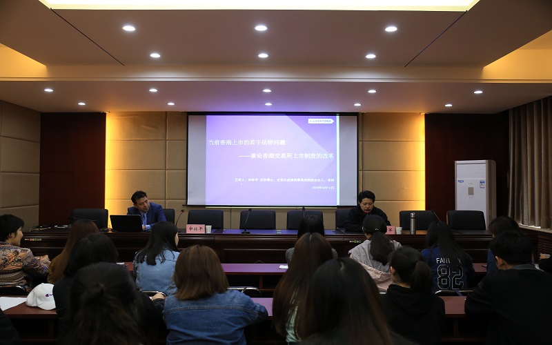 申林平结合自身工作经验以及枫叶教育香港联交所上市等相关案例,就当前境内企业在香港上市过程中的上市路径选择、上市制度改革以及境外设立离岸公司涉及的外汇管理、红筹上市的有关法律问题进行解读。自由讨论环节,法学院师生就中国股市相关问题与申林平作了交流。