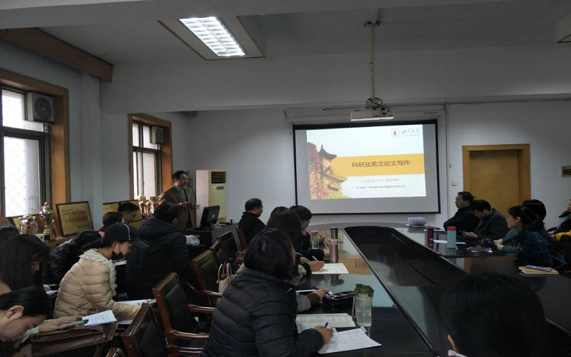 王元地以自己的一篇被国际知名期刊拟录用的论文为例,为大家讲解了英文专业论文的写作方法、技巧及需要重点注意的问题。他结合自己做学术研究的经历和心得,为大家详细解释了“科研”的含义,以及科研与论文的关系。王元地认为科研是“做”,论文是“编”,先做后编,编写论文要以科研为依据,不能凭空套用他人的想法,更不可“拍脑袋”,同时提醒大家发表论文不是一件容易的事,发表被拒是很正常的,写论文也是与别人的一种交流方式,最难的部分就是开始去写。他鼓励大家勤动手,多实践。讲座结束后,部分教师针对英语论文写作及专业领域内的问题进行提问,王元地教授作了详细解答。