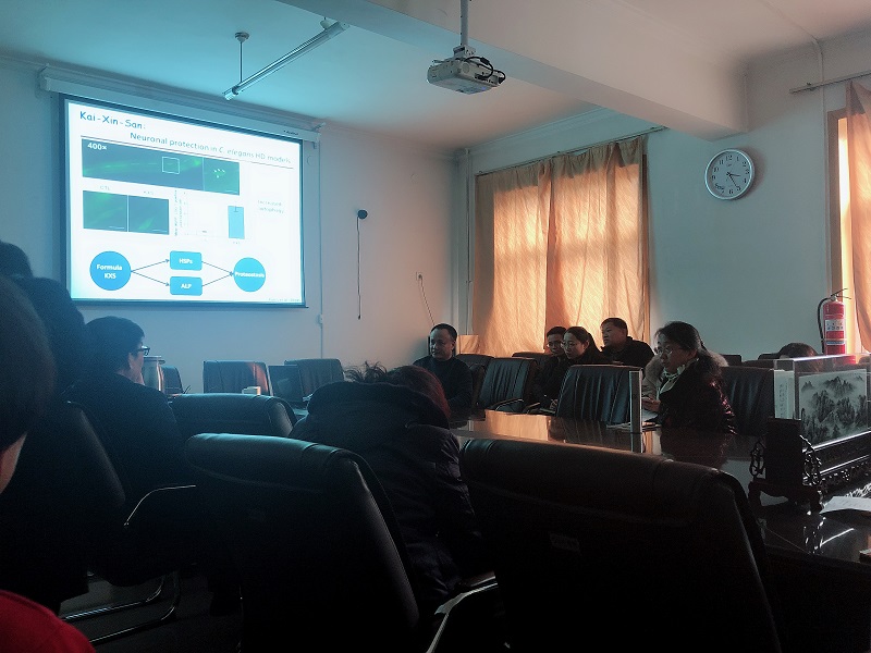 黄泽波教授介绍了其团队在活性多糖、活性多肽及小分子化合物等天然产物在延缓衰老及衰老相关疾病进程方面的研究方法及成果,重点分享了秀丽线虫模型在人类疾病及活性物质功能性研究中的优势和用于高通量筛选的可行性,并介绍了基于秀丽线虫模型的整体动物水平的高通量活性筛选平台和Ec-Ce活性蛋白规模化筛选系统,以及利用该平台和系统取得的阶段性成果。报告结束后,黄教授解答了学院教师提出的疑问,并与参会教师进行了深入交流。
