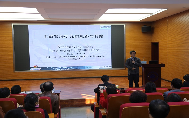 10月30日下午,对外经济贸易大学国际商学院院长、长江学者、国家杰出青年、国务院特殊贡献专家王永贵应工商管理学院邀请,作题为“工商管理研究的思路与套路”的学术报告。校党委常委、工商管理学科带头人陈亮教授出席并发言。报告会由校党委常委、副校长武建奇教授主持,工商管理学院全体教师及部分研究生、管理科学与工程学院及经研所相关教师聆听。