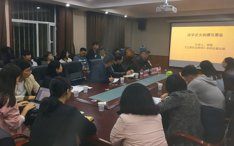 10月13日,《江西社会科学》杂志社副主编胡炜应法学院邀请,在法学院会议室作题为“法学论文的撰写要旨”的学术报告。报告会由法学院副院长胡海涛主持,60余名法学院师生聆听。