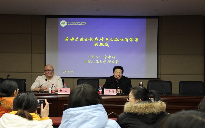 12月12日,中国人民大学涂永前研究员应法学院邀请,在法学综合实验教学中心报告厅作题为“劳动法该如何应对灵活就业所带来的挑战”的学术报告。报告会由院长王利军主持,学院70余名师生参加。