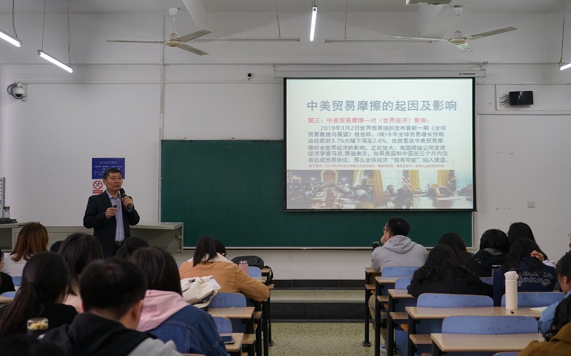 4月13日下午,会计学院在第三教学楼B202教室举办“中美贸易摩擦的起因及影响”专题讲座。石家庄水务集团财务处处长、河北地质大学研究生社会导师、正高级会计师陈永伟应邀主讲,学院2018级研究生参加。