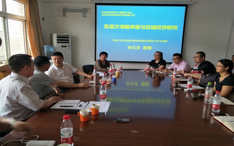 5月17日下午,经济研究所举办第193期知行论坛、京津冀协同发展系列讲座第6讲。著名区域经济学家、中国人民大学区域与城市经济研究所所长孙久文教授应邀作《高层次课题申报与区域经济研究》专题报告,副校长武义青出席报告会。报告会由经济研究所所长田学斌主持,经济研究所、京津冀一体化发展协同创新中心全体师生和商学院部分老师参加。