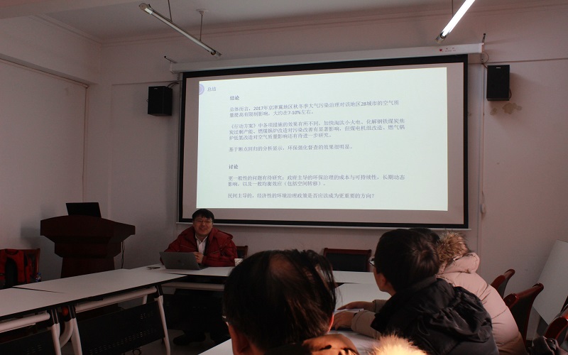 张吉鹏讲解了自己的最新成果《环境治理中的绩效评估与央地关系—基于2017年“2+26”城大气污染治理与督查的实证分析》。他介绍了2013年至2017年间京津冀地区出台的各项环保政策,利用基准回归和假设性检验两种方式对上述环保政策进行了效果评估。他认为,2017年京津冀地区秋冬季大气污染对该地区28城市的空气质量提高有限制性影响,大约在7%-10%左右;《行动方案》中各项措施的效果有所不同,加快淘汰小火电,化解钢铁煤炭焦炭过剩产能、燃煤锅炉改造对污染改善有显著影响,但煤电机组改造、燃气锅炉低氮改造对空气质量影响还有待进一步研究。与会教师就环保污染企业治理等问题与张吉鹏教授进行了互动交流。