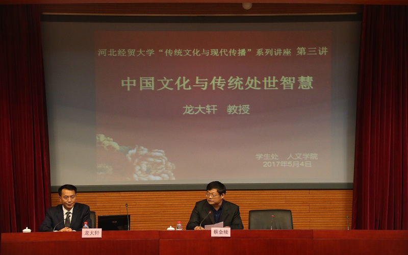 新闻中心讯(记者 陆炳旭)5月4日晚,央视《法律讲堂》主讲专家、西南政法大学教授、博导、中国儒学与法律文化研究会执行会长龙大轩应学生处和人文学院邀请,在国际学术报告厅作“中国文化与传统处世智慧”主题讲座。讲座开始前,人文学院院长张金桐代表学院与西南政法大学中国法文化研究传播中心代表龙大轩共同签署了《传统文化普及战略合作协议》。本次讲座由学生处处长蔡金续主持,学生处、人文学院、工商管理学院等负责人及学生代表300余人聆听。