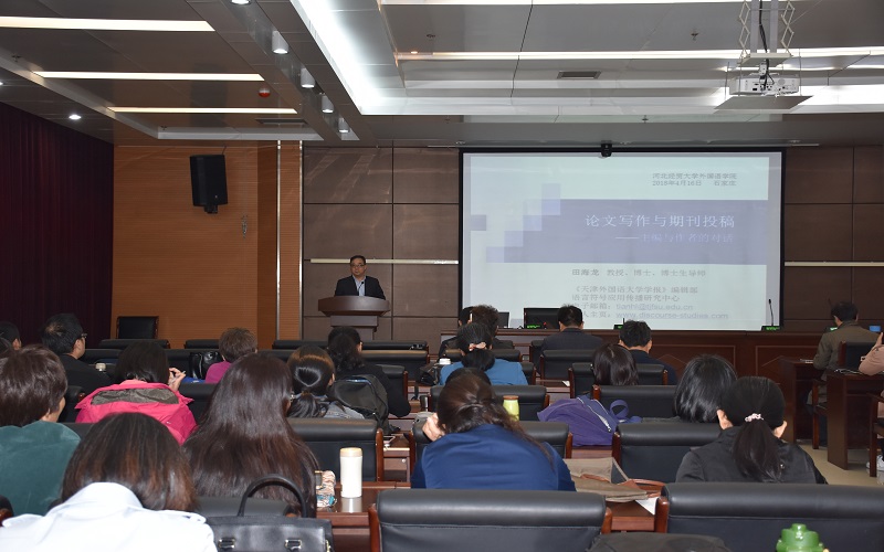 4月16日下午,天津外国语大学博士生导师、《天津外国语大学学报》常务副主编田海龙教授应外语教学部邀请,在第三会议室作题为“论文写作与期刊投稿——主编与作者的对话”的学术报告。报告会由外语部主任高霄主持,外语部全体教师参加。