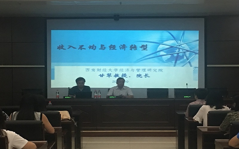 9月10日下午,美国A&M大学经济系终身教授、西南财经大学经济与管理研究院院长、中国家庭金融调查与研究中心主任甘犁应金融学院邀请,在第三会议室作题为“收入不均与经济转型”的学术报告。校党委常委、副校长武建奇出席并主持报告会,河北省金融学会部分会员单位和金融学院师生100余人一起聆听了报告。
