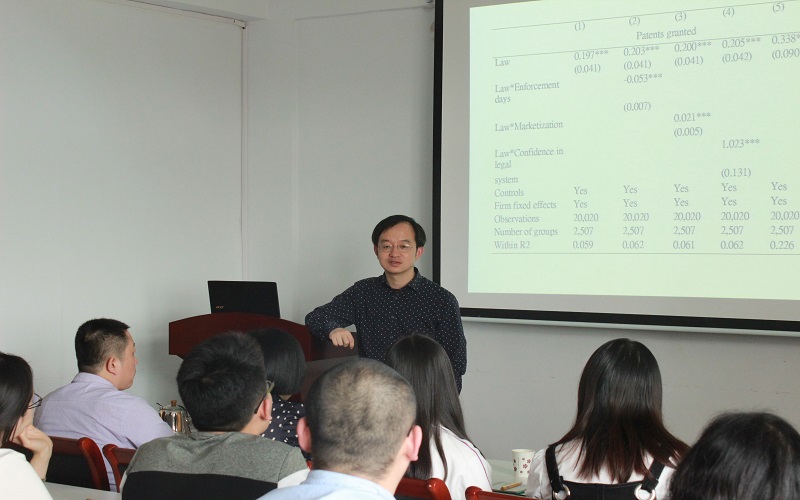 4月27日下午,上海财经大学副教授、博士生导师吴一平应商学院邀请,为“商学纵横”品牌学术论坛作题为“物权保护是否影响企业创新”的学术报告。报告会由贸经系主任郭娜主持,学院部分师生参加。