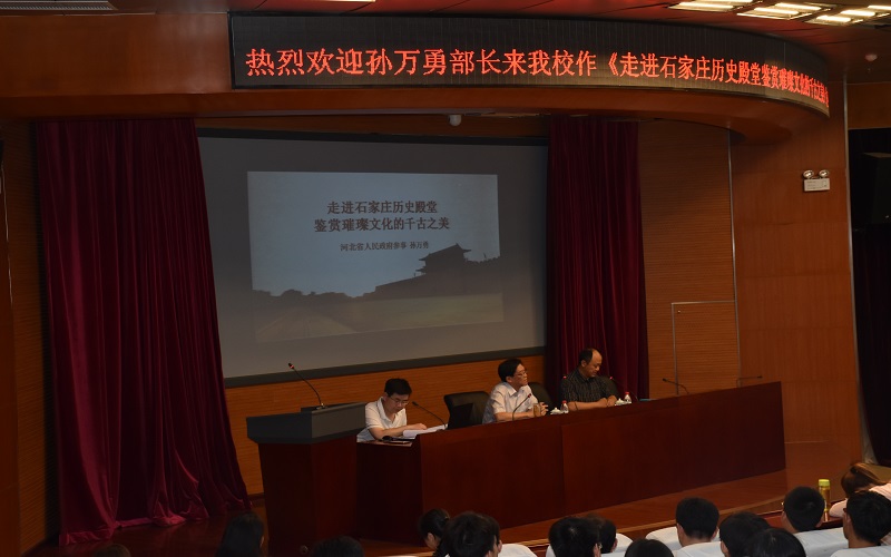 孙万勇从新乐伏羲台、正定新城铺的鲜虞国、春秋时期的中山国等史迹着眼,讲述了石家庄6000多年历史长河中的发展、变迁。他对苍岩山桥楼殿、赵州桥、隆兴寺等物质文化遗产背后的精彩典故,以及南越王赵佗、常山赵子龙、赵县铁凝等杰出人物的逸闻趣事进行了介绍。孙万勇还讲述了石家庄在新中国建立过程中发挥的重要作用,并回顾了习近平总书记任正定县委书记时的感人事迹。他认为,石家庄璀璨历史文化中体现出来的是大爱之美、大艺之美、大智之美。他希望同学们社会生活中树立正确的审美观、人生观和价值观。