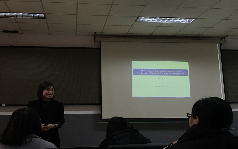 11月22日上午,对外经济贸易大学副教授、校友席丹应金融学院邀请,在C教516作题为《Capital account liberalization and aggregate productivity》的学术报告。报告会由金融学院院长王重润主持,80余名教师和研究生聆听。