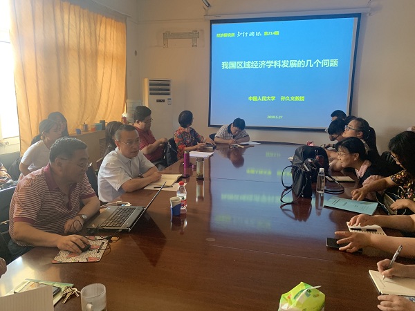5月27日,经济研究所举办第214期知行论坛,中国人民大学孙久文教授应邀作《我国区域经济学科发展的几个问题》专题报告。报告会前,校党委副书记、校长刘兵与孙久文教授亲切会谈,就国家课题申报、中青年教师高层次课题申报能力提升等问题进行交流,副校长武义青参加座谈。
