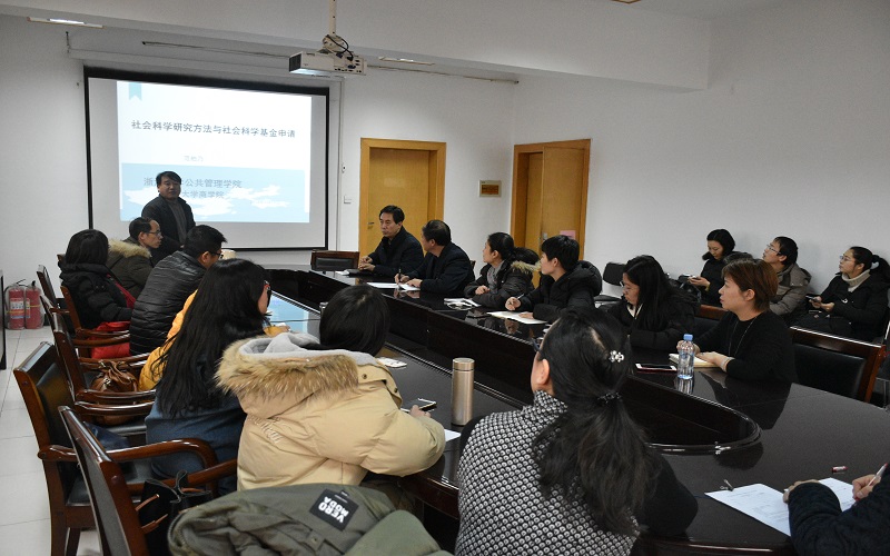 1月19日下午,浙江大学范柏乃教授应公共管理学院邀请,在第二办公楼301室作题为《社会科学研究方法与社会科学基金申报的方法与技巧》的学术讲座。讲座由院长蔺丰奇主持,党委书记薛向东与部分教师聆听。