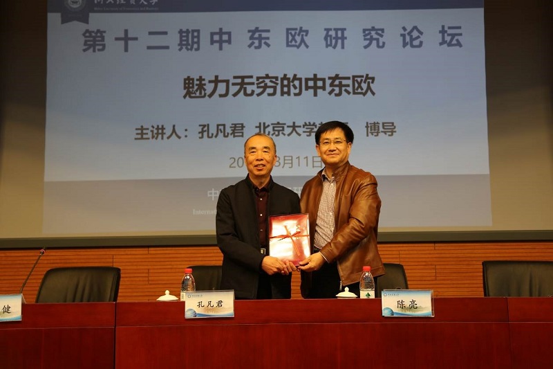 3月11日,中东欧国际商务研修学院在国际学术报告厅举办第十二期“中东欧研究论坛”。论坛邀请北京大学国际关系学院孔凡君教授作“魅力无穷的中东欧”专题讲座。校党委常委陈亮教授出席并为孔凡君教授颁发客座教授聘书,国际教育学院、中东欧国际商务研修学院、塞尔维亚研究中心、旅游学院和商学院师生以及河北地质大学捷克研究中心人员参加。论坛由中东欧国际商务研修学院副院长成健教授主持。