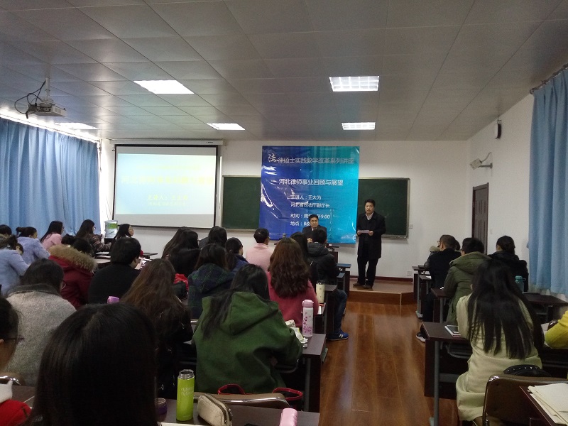 11月4日上午,法学院邀请河北省司法厅副厅长王大为作“河北律师事业回顾与展望”主题讲座。讲座由法学院副院长王利军主持,学院近200名学生聆听。