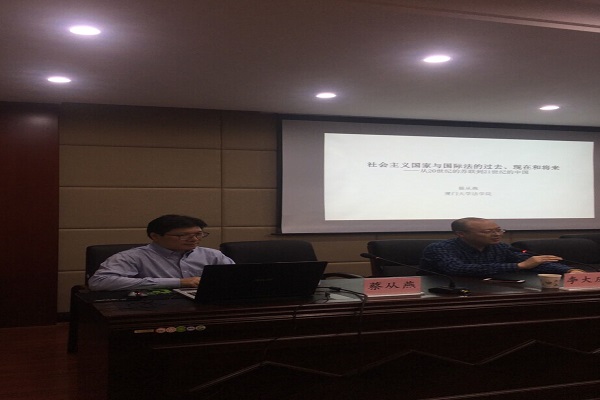蔡从燕教授以“史密斯与伊肯伯里:谁是对的?”作为导论,抛出两种不同观点引起同学们的思考,之后阐述了社会主义国际法的要义。讲到社会主义国家与国际法,他指出,苏联国际法律政策的变迁是以苏共二十大为分界点,与之对应的是社会主义中国的国际法,是以1978年国际法律政策为分界点。他特别强调了在西方国家的多方面封锁与扼杀之下,社会主义法的进步和发展不易。他讲述了西方国家近年来针对中国的重大国际法律“反击”行动,包括贸易和投资两个方面,贸易方面包括美国-加拿大-墨西哥贸易协定等,投资方面包括TPP、CFTPP等贸易协定。最后蔡从燕教授给同学们留下了一个值得深思的问题:“国际法的包容性:谁包容谁?”。他表示相信随着国际社会和国际法的发展,这个问题的发展方向会逐渐明晰。