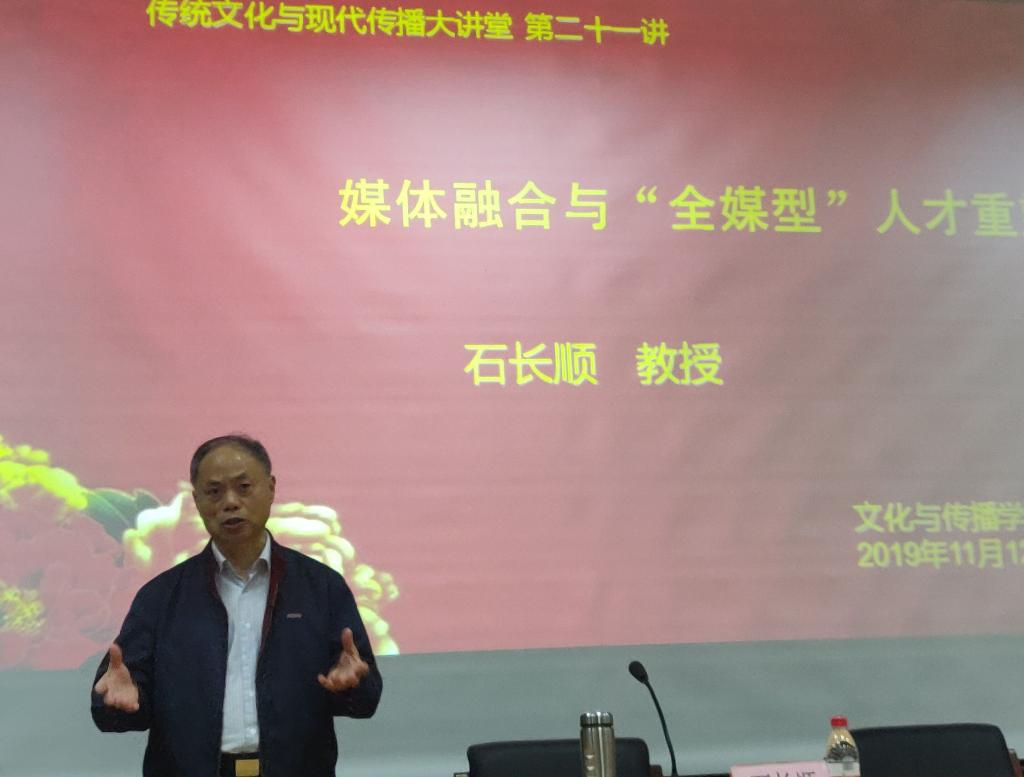新闻中心讯(记者 孙晨尧)11月12日上午,文化与传播学院邀请华中科技大学广播电视与新媒体研究院院长、博士生导师石长顺教授到KY开元作题为“媒体融合与‘全媒型’人才重塑”的主题讲座。学院副院长景义新主持,学院副书记仇静莉到场,教师代表、本科生、研究生共计400余人参加。