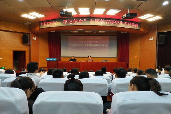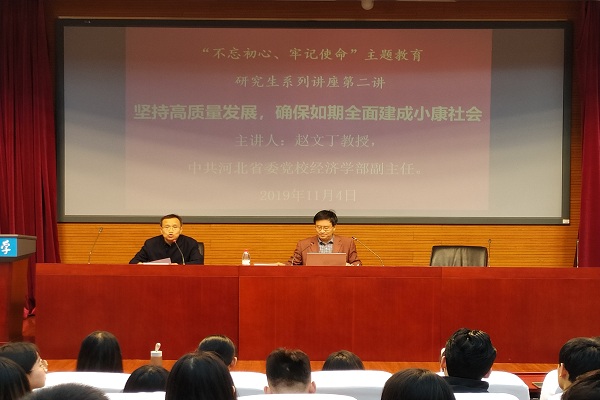 11月4日下午,研究生学院主办的“不忘初心、牢记使命”主题教育——研究生系列讲座第二讲在国际学术报告厅举行。中共河北省委党校赵文丁教授应邀为全校研究生作题为“坚持高质量发展,确保如期全面建成小康社会”的专题报告。