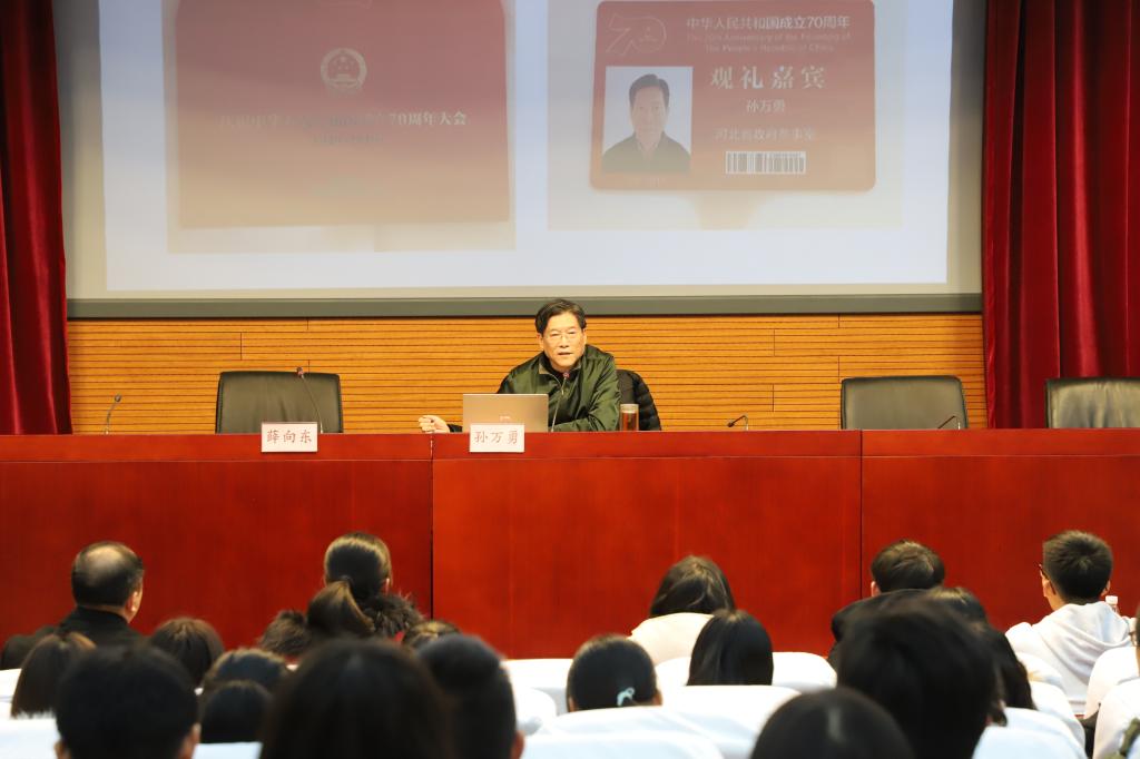 12月2日,公共管理学院邀请河北省政府参事室特约研究员、中华文化促进会常务理事孙万勇在国际学术报告厅做主题报告。报告会由学院党委书记薛向东主持,学院团委书记张宁及200多名学生参加。