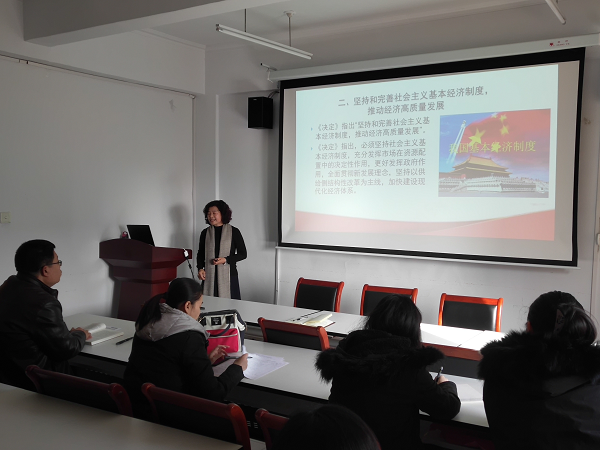 李英主讲的内容分两个部分。第一部分,李英以学习贯彻党的十九届四中全会精神为题,深刻阐述了全会召开的重大意义和总体要求,原原本本领学了关于“坚持和完善社会主义基本经济制度,推动经济高质量发展”的核心内容,深入解读了习近平总书记关于“社会主义基本经济制度”的深刻内涵。她号召全体党员,要深刻领会十九届四中全会的精神实质,做到融会贯通,学以致用,把“社会主义基本经济制度”核心内容落实到具体的课堂教学中,推动经济学专业课程与时俱进,不断改革,完善人才培养方案,实现为党育人、为国育才的培养目标。第二部分,李英总结了两年来落实导师制的具体做法和经验体会。她指出,作为导师要坚持期初有计划、期间有内容、期末有总结,特别是作为导师要时刻做到“心里有学生,一切为学生,用心带学生”的教学理念,使导师制成为学生交流、学习、锻炼以及展示自我的平台,引领学生健康成长,共同进步,实现梦想。