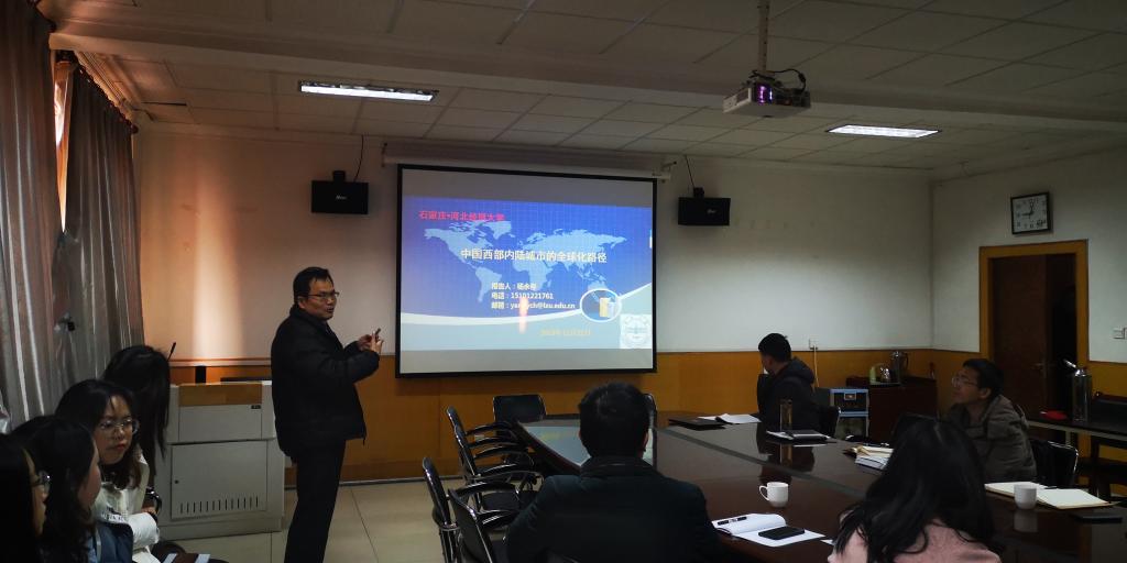 杨永春教授从我国全球化进程的大背景出发,以独特的视角,用简洁生动的语言和丰富详实的案例,为在场师生深度剖析了我国西部内陆城市的全球化路径。他首先详细回顾了我国的全球化进程,在此基础上分析了我国西部内陆城市的全球化路径及其特征,并通过世界500强企业分布、成都市世界500强企业分布、开发园区的全球化、河西走廊五市的全球化及文化休闲业的全球化这5个案例进行详细分析,探讨西部内陆城市的全球化路径。