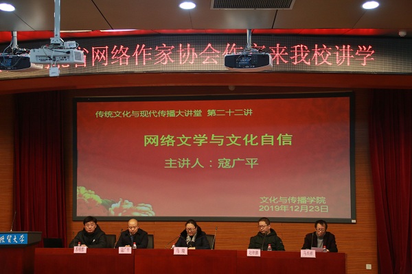 新闻中心讯(记者 吴梓然 吴佳珍) 12月23日下午,文化与传播学院邀请河北省网络作家协会副主席寇广平在国际学术报告厅作题为“网络文学与文化自信”的专题讲座。河北省网络作家协会副主席苏明哲以及河北省作家协会《长城》编辑部编辑赵轶鹏一同出席。本次讲座由文化与传播学院副院长马瑞主持,中国语言文学系主任马兴祥及学院中文系全体学生参加。