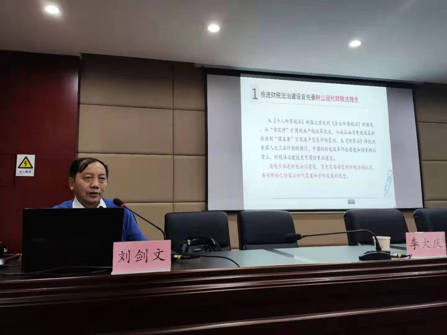 12月23日,法学院邀请中国法学会财税法学研究会会长、北京大学法学院教授、教育部“长江学者”特聘教授刘剑文作题为“新时代财税法治建设的目标与路径”的学术报告,法学院副院长李大庆主持,学院80余名本科生、研究生及教师参加。