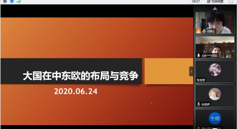 6月24日下午,由国际教育学院和中东欧国际商务研修学院联合举办的第24期“中东欧研究论坛”在腾讯会议平台举行。论坛邀请中国社会科学院朱晓中研究员作“大国在中东欧的布局与竞争”主旨报告。本次报告由中东欧国际商务研修学院副院长刘海云教授主持,来自本学院、商学院、外国语学院、会计学院的师生,以及浙江金融职业学院捷克研究中心、西安外国语大学波兰研究中心等单位的老师共计40余名参加。
