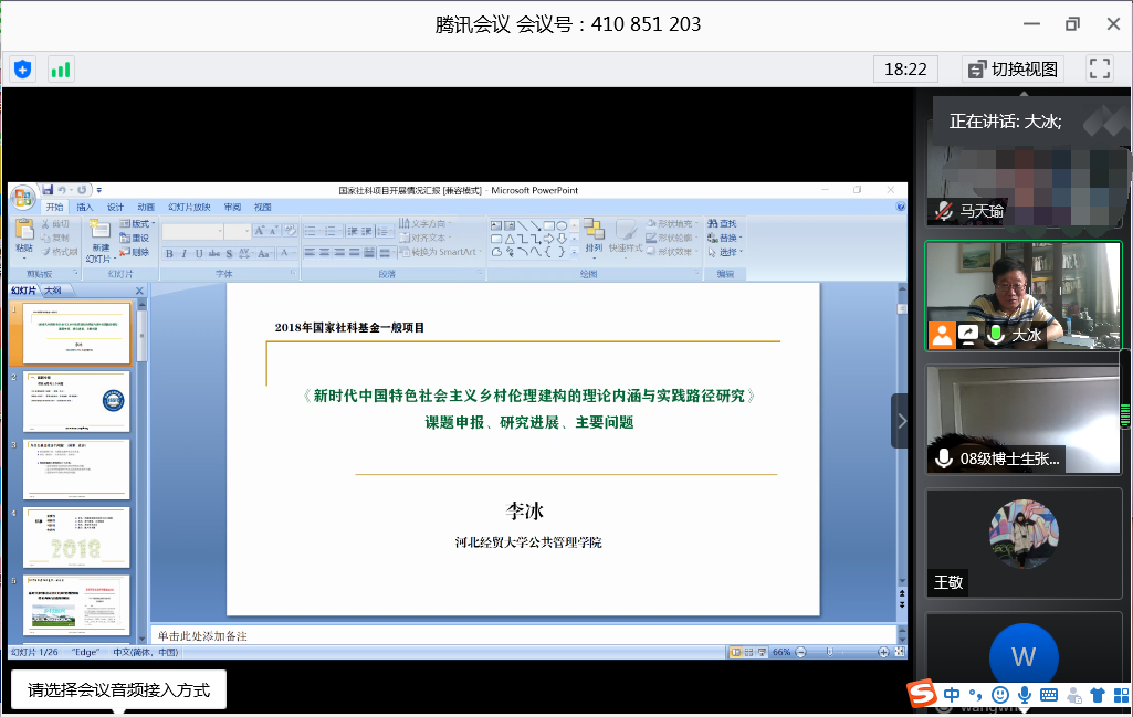 李冰教授针对他主研的2018年度国家社科基金项目《新时代中国特色社会主义乡村伦理建构的理论内涵与实践路径研究》,系统介绍了项目的研究背景和意义、研究内容等,并对研究现状等方面进行了详尽的讲解。针对其在“新时代乡村伦理的实践模式”研究过程中调查数据整理、分析等方面存在的问题,李冰教授表示期盼能与更多学院的老师合作,共同在乡村文化相关领域中进行理论与实践的探讨。
