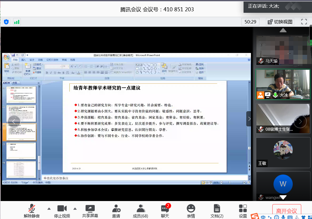 随后,李冰教授就申报体会、经验等与参会人员进行了深入交流,并给青年教师在学术研究上提出了不断积累研究成果、积极参加学术会议、研究课题由小到大等建议。