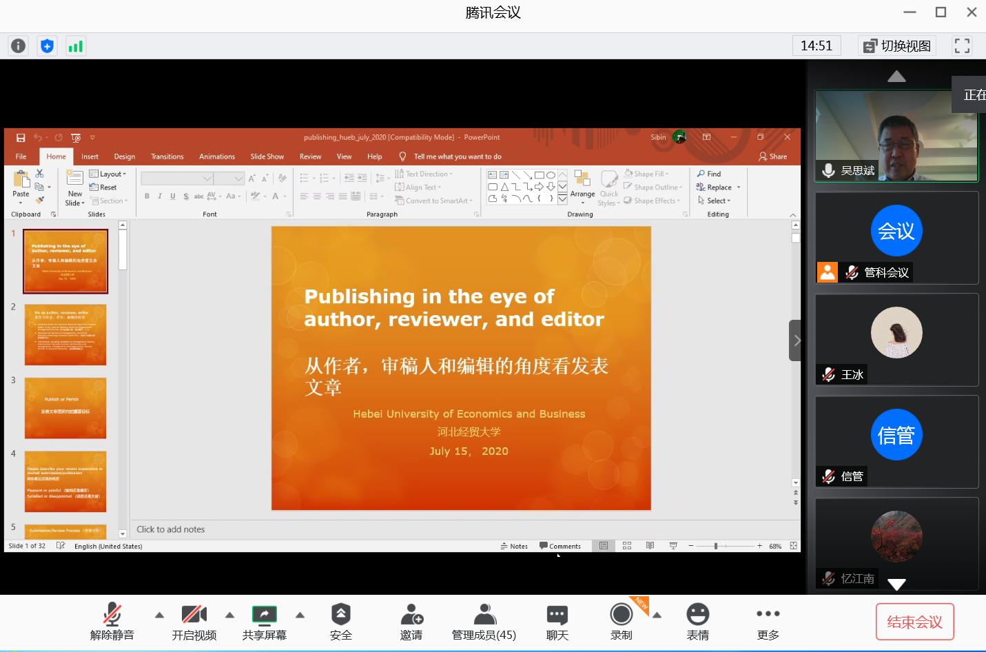 7月15日,美国德克萨斯大学吴思斌教授应管理科学与工程学院邀请,通过腾讯会议平台作了题为《从作者、审稿人、编辑的角度看发表文章》的学术讲座。讲座由院长祁红梅教授主持,学院教师、研究生、部分本科生以及部分其他学院教师在线聆听了此次讲座。