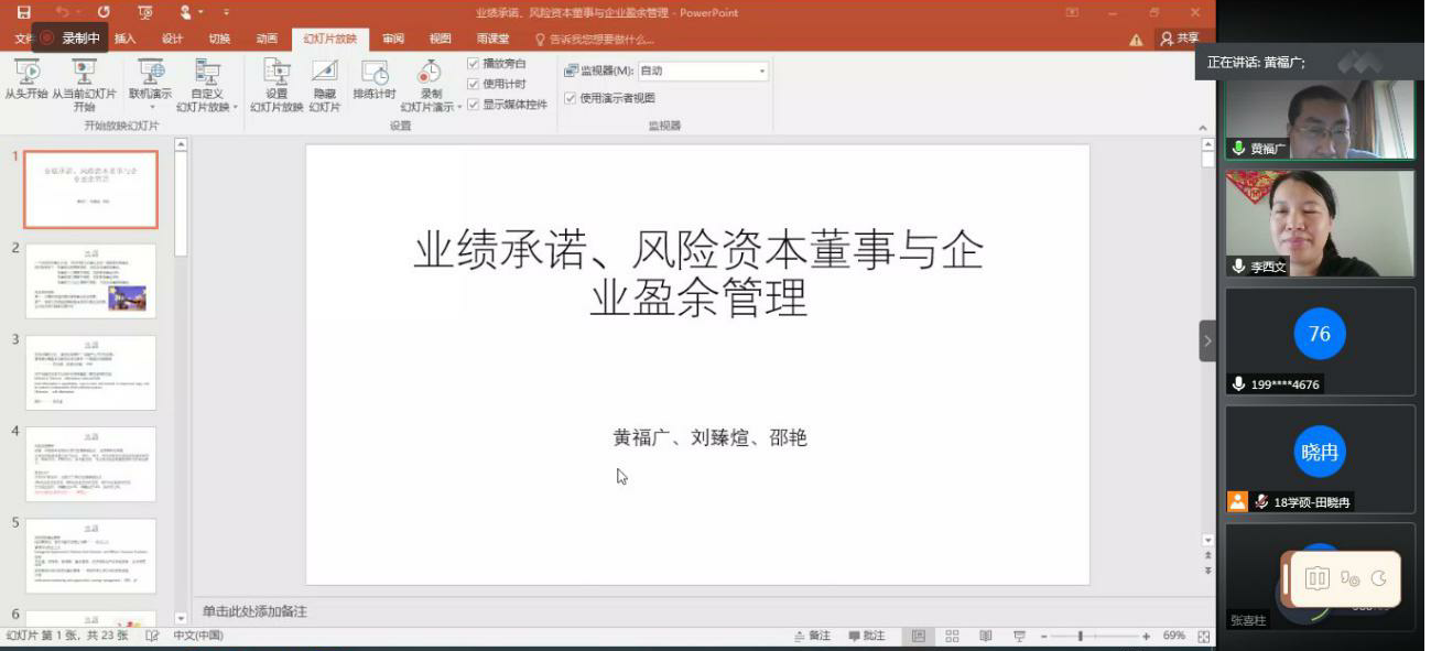 8月20日上午,南开大学商学院黄福广教授应会计学院邀请,通过腾讯会议平台为师生作题为“业绩承诺、风险资本董事与企业盈余管理”的讲座。会议由会计学院副院长李西文主持,学院教师及2018级、2019级会计学硕研究生60余人参加。
