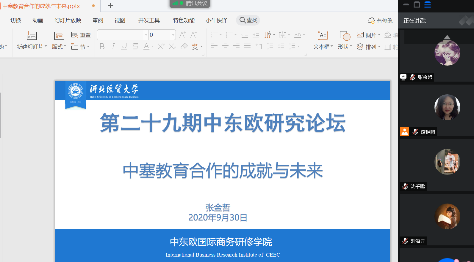 9月30日下午,由国际教育学院和中东欧国际商务研修学院联合举办的第29期“中东欧研究论坛”在腾讯会议平台举行。中东欧国际商务研修学院张金哲老师作“中国与塞尔维亚教育合作的成就与未来”主旨报告。会议由中东欧国际商务研修学院副院长刘海云教授主持,来自本学院、商学院、会计学院、外国语学院部分教师和研究生40余人参会。