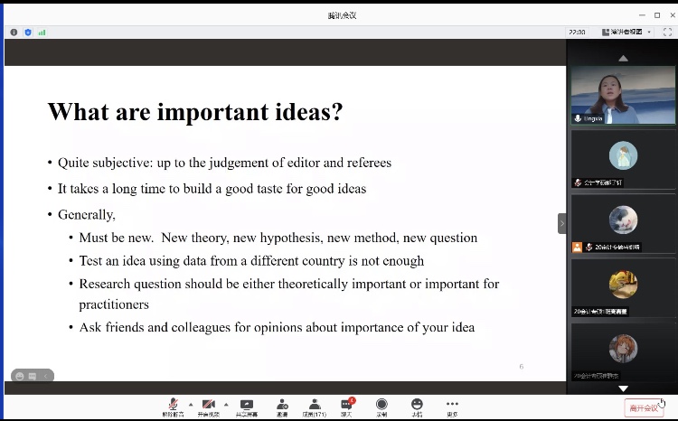 10月13日上午,中山大学国际金融学院孙凌霞博士应会计学院邀请,通过腾讯会议平台为同学们作题为《如何撰写和发表高水平论文》的报告。会计学院副院长李西文和学院部分教师及2019级、2020级全体研究生参加了本次讲座。