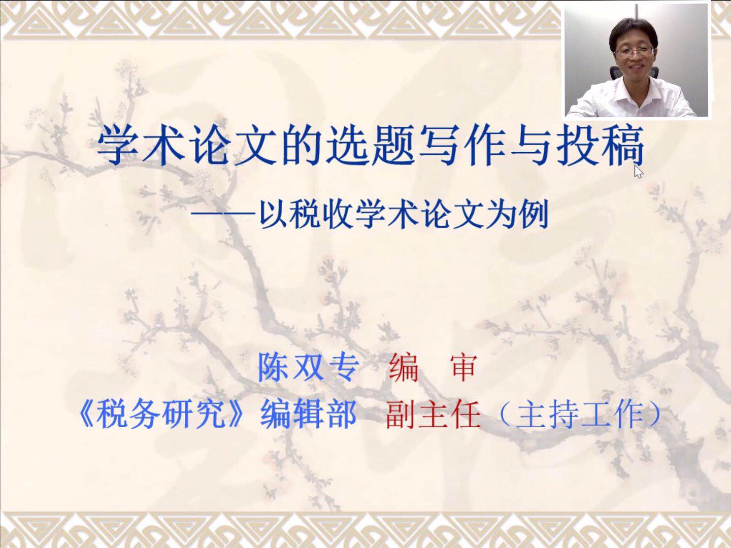 10月15日晚,《税务研究》杂志编辑部副主任陈双专应法学院邀请,通过腾讯会议平台作题为“学术论文的选题写作与投稿”的专题讲座。法学院副院长李大庆主持,60余名研究生在线聆听。