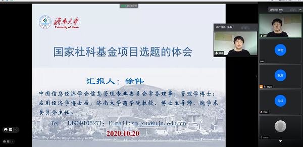 10月20日,济南大学博士生导师徐伟教授应商学院邀请,于线上作“国家社科基金项目选题的体会”学术报告。报告由商学院副院长刘振滨主持,学院30余名教师参加。