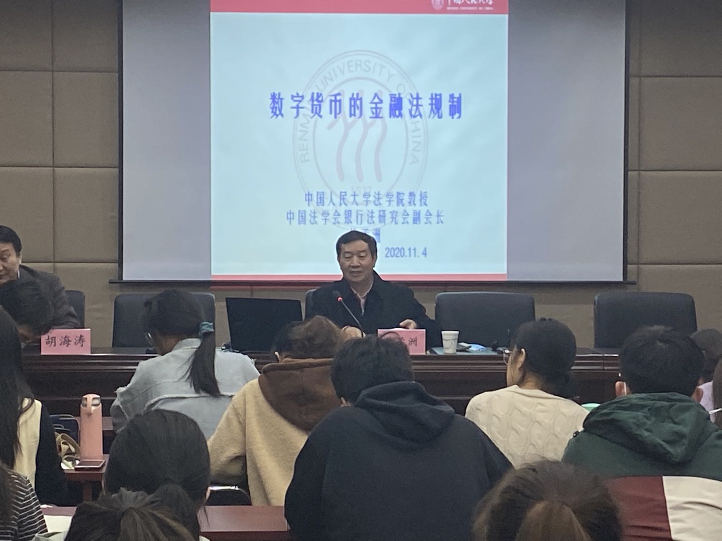 11月14日晚,法学院邀请中国法学会银行法学研究会副会长、中国人民大学博士生导师徐孟洲教授来校作题为《数字货币的金融法规制》的专题讲座,法学院副院长胡海涛主持,100余名研究生参加。