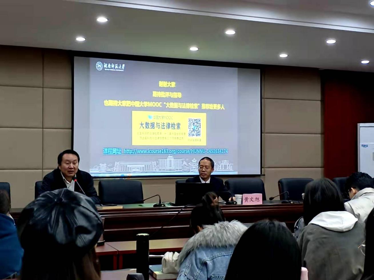 11月20日下午,法学院邀请湖南师范大学法学院国际法研究所所长、中国大学MOOC《大数据与法律检索》主讲人黄文旭来校作题为“大数据与法律检索”的专题讲座,法学院副院长胡海涛主持,七十余名研究生参加。