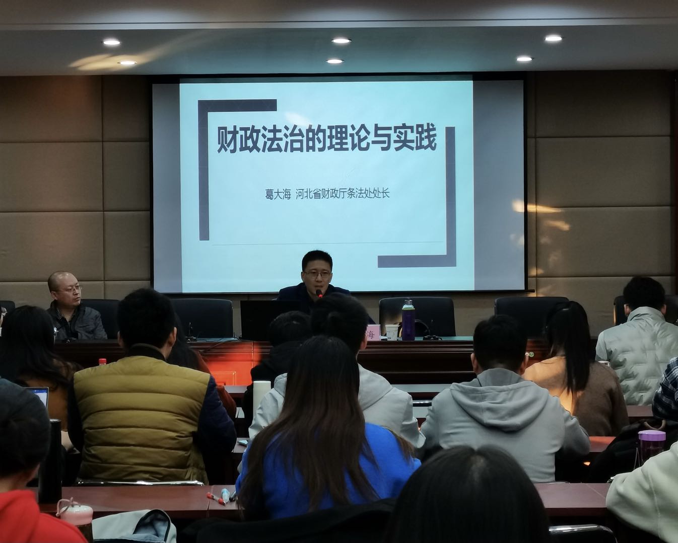 11月19日下午,法学院邀请河北省财政厅条法处葛大海处长来校作题为“财政法治的理论与实践”的专题讲座。法学院副院长李大庆主持,七十余名研究生参加。