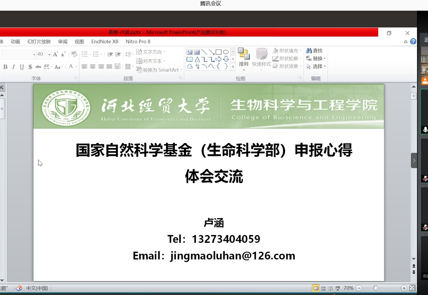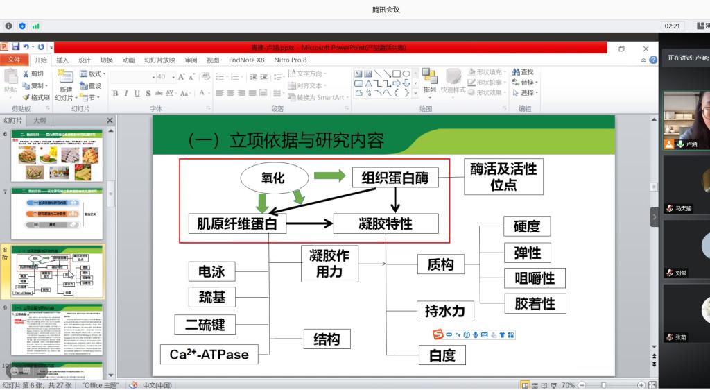 卢涵针对他主持的2018年度国家自科基金项目《氧化调控鱼糜凝胶特性机理研究》,就课题的立项依据、研究内容、研究目标、研究方法、研究的技术路线、研究的基础以及可行性分析作了详细讲解,并分享了申报国家自科基金项目的经验和心得。针对研究进程中存在的问题,如怎样进一步利用信息技术手段分析研究实验数据,如何更好地进行学科交叉融合,卢涵表示期盼能与更多学院的老师进行合作、交流与探讨。