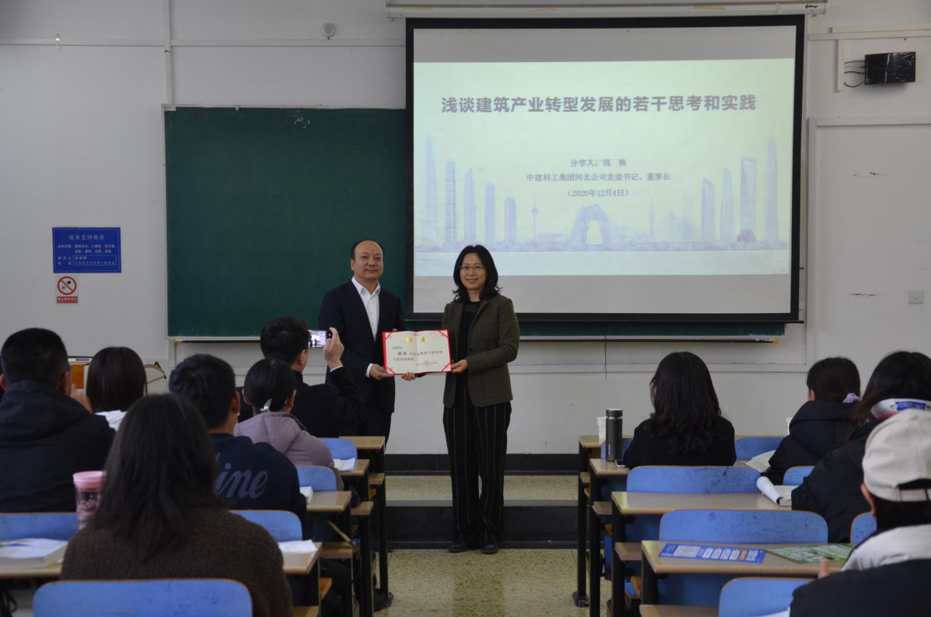 钱焕董事长结合中建科工集团的实践项目案例,就EPC总承包模式、装配式建筑、BIM智能化管理等方面,从发展的眼光详细地讲述了建筑业转型升级中面临的实践问题。他强调,建筑业会以大力发展建筑工业化为载体,以数字化、智能化升级为动力,将逐步加大智能建造在工程建设各环节应用力度。讲座最后,钱焕董事长与同学们进行了广泛交流,耐心解答了同学们提出的问题。