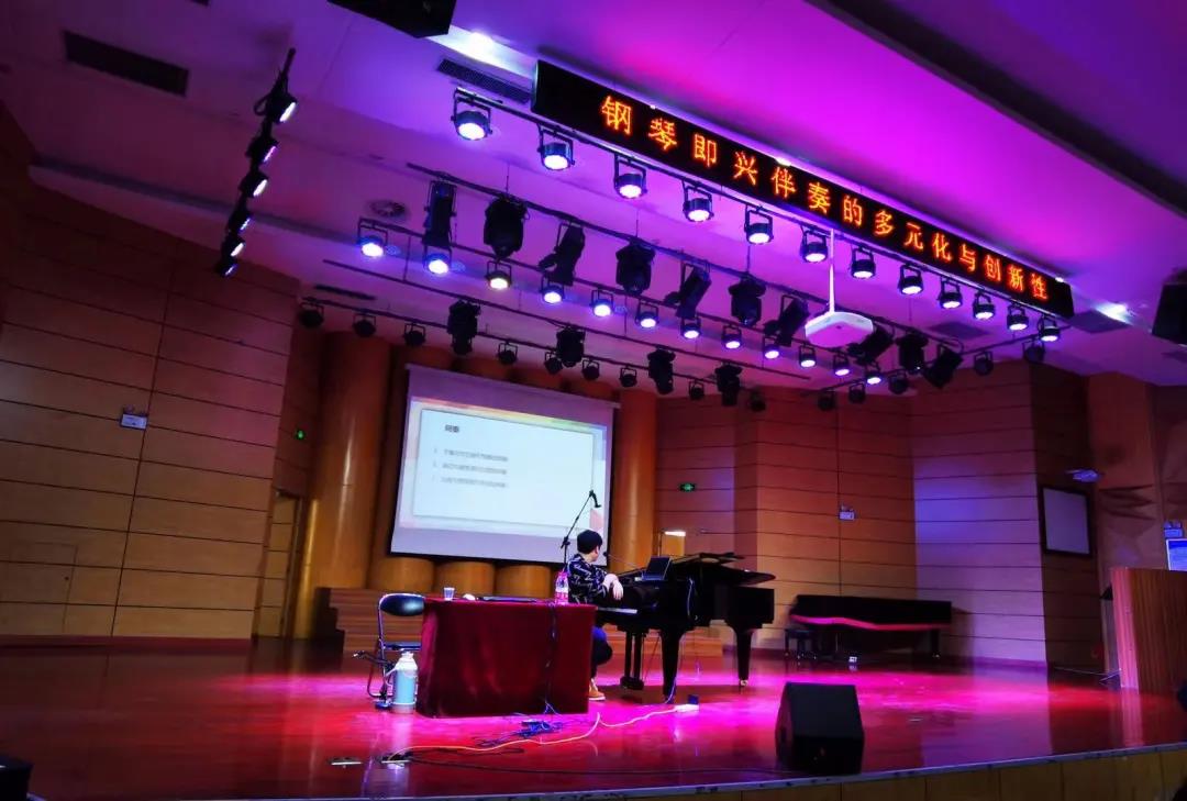 王宇航老师向大家介绍了提高钢琴即兴伴奏能力的技巧方法,以“互联网+”新技术手段服务中小学美育教育为主题,通过讲授、演奏、指导等多种形式为同学们上了一堂生动的钢琴即兴伴奏课。