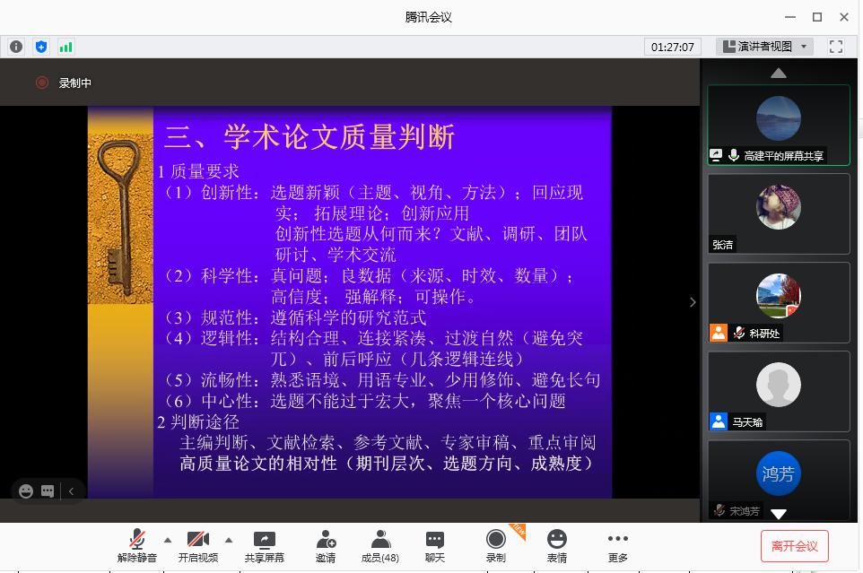 12月10日,《科技进步与对策》杂志副主编、科技进步研究中心主任高建平研究员为KY开元作题为“如何写出高质量研究论文”学术讲座。讲座由科研处副处长李伟红教授主持,KY开元教师及研究生50余人在线聆听了此次学术讲座。