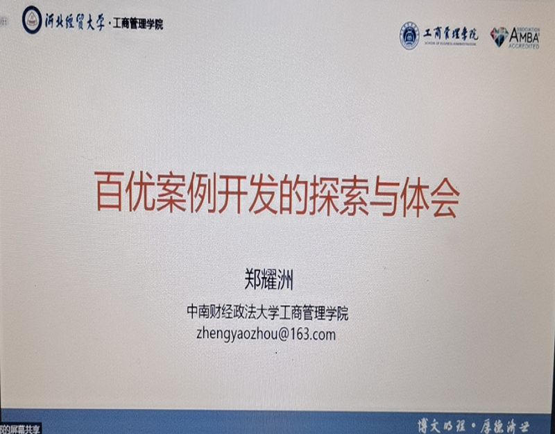 12月16日,中南财经政法大学案例中心副主任、全国百优案例函审专家郑耀洲副教授应工商管理学院邀请作题为“百优案例开发的探索与体会”的线上专题报告。