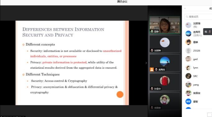霍峥对隐私保护技术和科研项目申报过程中的相关经验进行了介绍。在隐私保护方面,介绍了社交网络、电子商务等领域相关隐私保护技术,针对泛化法、抑制法、差分隐私法进行了相关举例和说明。在科研项目申报方面,霍峥对自己的科研项目申报之路进行了分享,介绍了自己的宝贵经验,鼓励广大青年教师坚定信心、持之以恒、不断创新。