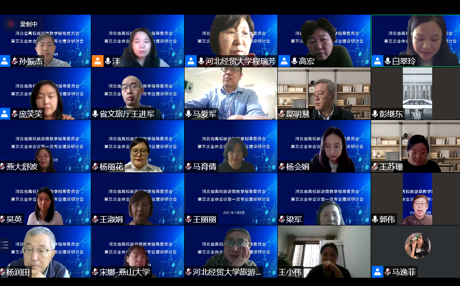 1月5日,河北省高等学校旅游类教学指导委员会召开第三次全体会议暨一流专业建设研讨会。考虑新冠疫情防控需要,本次会议线上举行。会议由河北省高校旅游类教学指导委员会主办,KY开元集团官网旅游学院承办。河北省教育厅高教处彭继东处长出席并致辞,河北省文化和旅游厅科技教育处处长王进军、河北省地理科学研究所党委书记邸明慧研究员、河北省高校旅游管理类教学指导委员会主任委员、KY开元集团官网副校长程瑞芳教授等出席会议并作了主旨报告。
