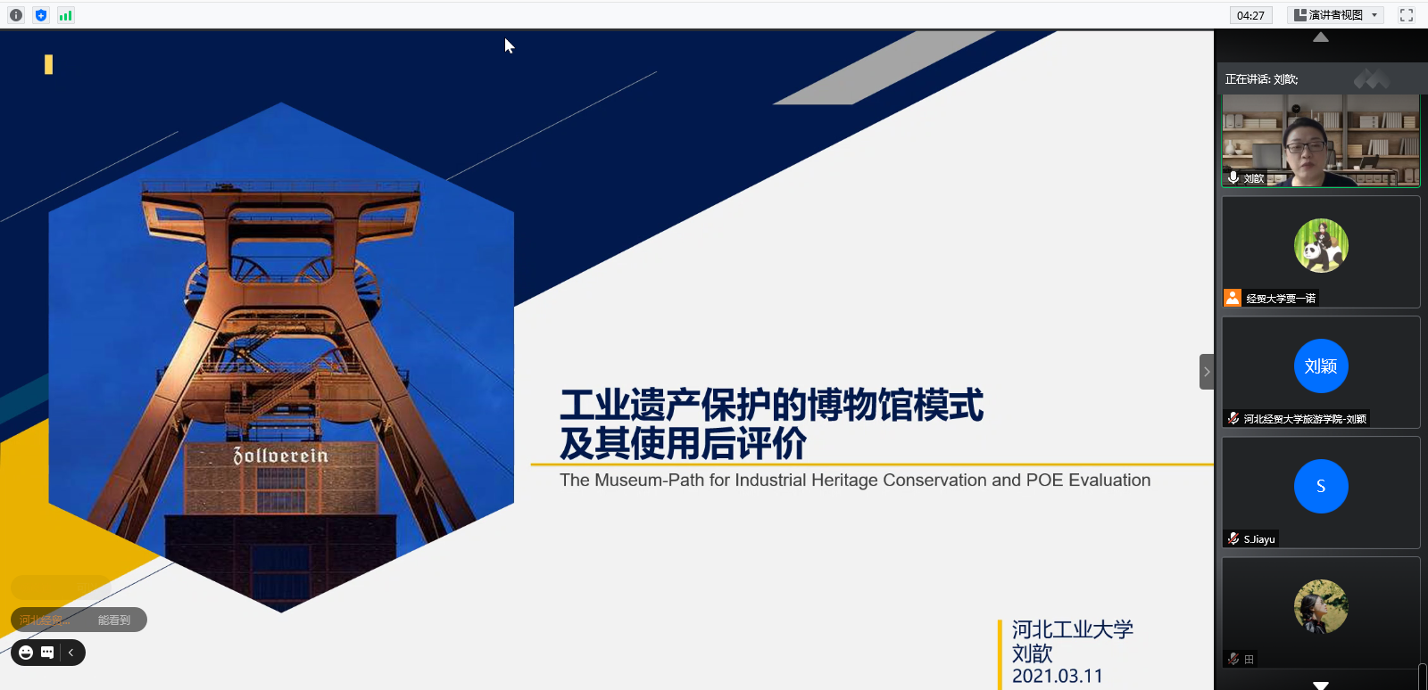 3月11日下午,河北工业大学建筑与艺术设计学院刘歆副教授应旅游学院邀请作题为“工业遗产保护的博物馆模式及其使用后评价”的线上学术讲座。讲座由旅游学院副院长吴士锋主持,旅游学院各专业教师、研究生及本科生近40人参加了讲座。